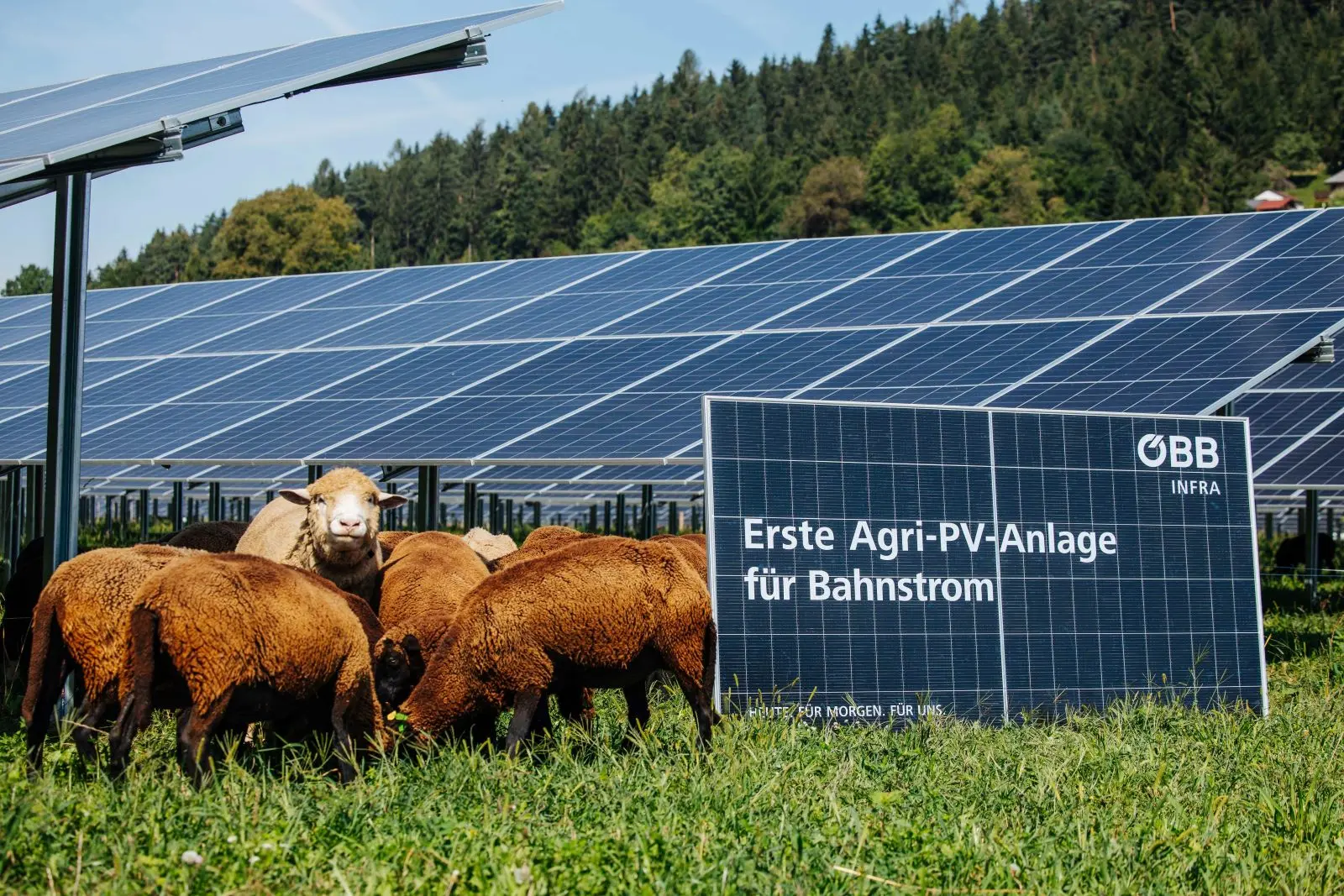 Besichtigen Sie die weltweit erste Agri-PV-Anlage für 16,7-Hz Bahnstrom. Diese innovative Anlage wird ab 2025 Strom für 4.000 Railjetfahrten von Villach nach Wien liefern. Gleichzeitig wird sie Schatten für 6.000 Hühner und 60 Schafe spenden.